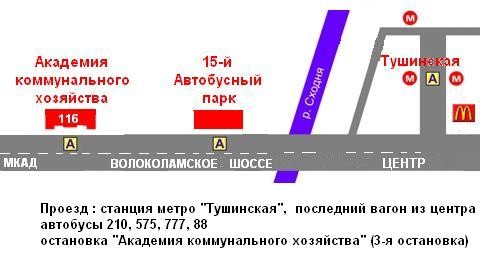 м. Тушинская, далее автобусами 210, 640, 631, 575, 777, 88, 542, 549, 541 до остановки "Академия коммунального хозяйства".